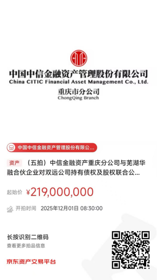 安博app下载地址重庆市分公司(简称:中信金融资产重庆分公司)与芜湖华融资本创荣投资中心(有限合伙)(简称:芜湖华融合伙企业)对重庆双远实业(集团)有限公司(简称:双远公司)持有债权及股权,将于2025年12月1日08时30分至2025年12月1日17时30分在京东拍卖网通过公开竞价方式进行处置,拍卖链接如下图所示,现予以公告。